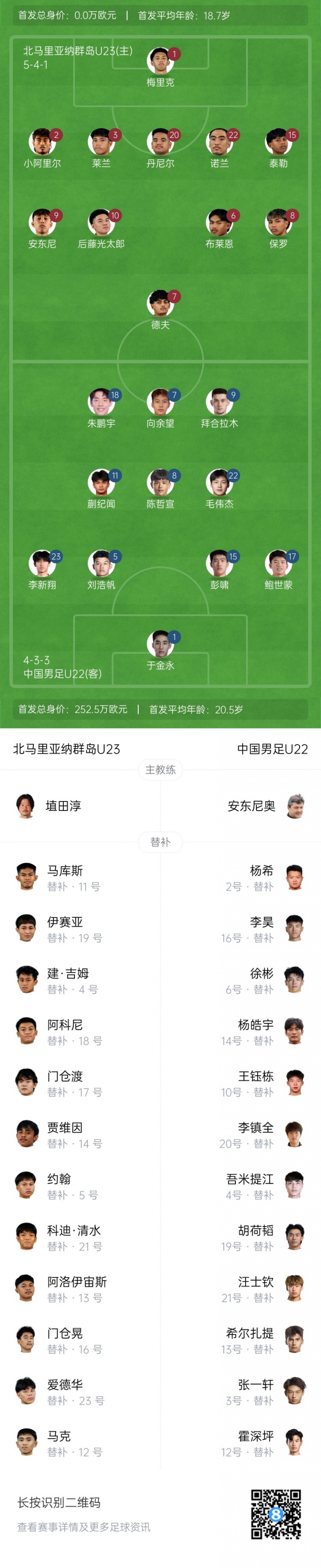 中国U22首发:1-于金永、5-刘浩帆、15-彭啸、17-鲍世蒙、8-陈哲宣、11-蒯纪闻、22-毛伟杰、23-李新翔、7-向余望、9-拜合拉木、18-朱鹏宇